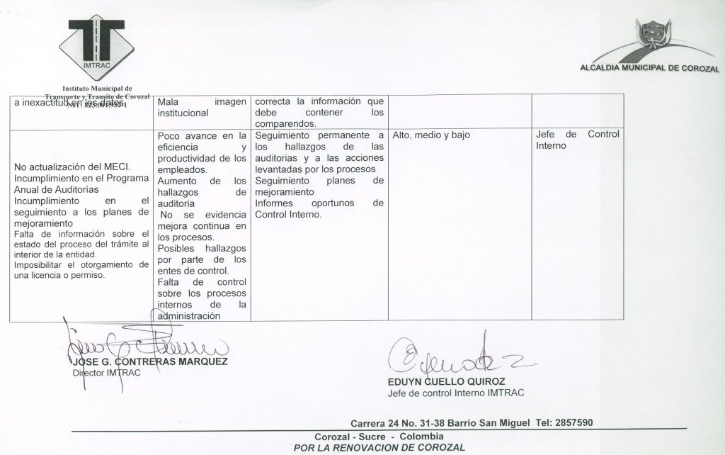 Informe de Sistema de Control Interno y Control Interno Contable de Instituto Municipal de Transportes y Tránsito de Corozal